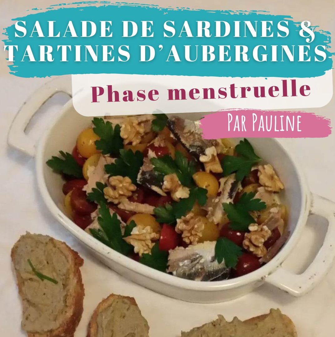 Ce mois-ci, nous retrouvons Pauline qui nous propose une belle salade de sardines avec ses tartines d’aubergines, idéale pendant la phase menstruelle.